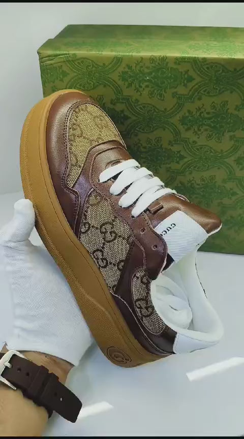 These sneakers are made from Gucci's signature GG Canvas. Trimmed in brown leather, they have classic lace-up fastenings and chunky rubber soles.